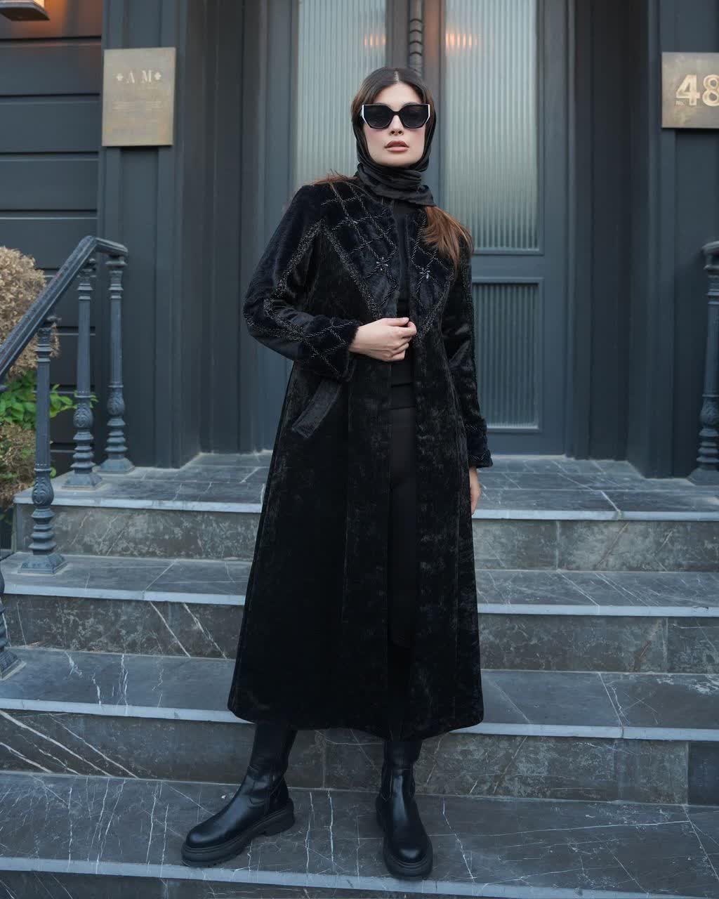 مانتو بلند مخمل ترکیب با پوست سنگدوزی